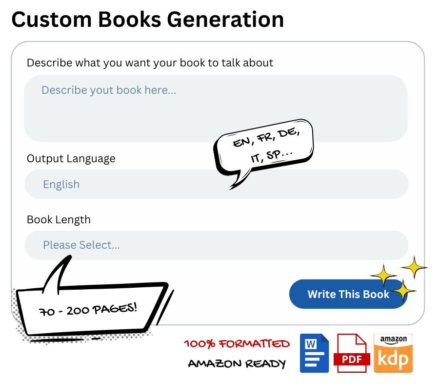 Enter your topic, key terms, preferred language, and desired length (70-200 pages). That's all we need to start crafting your book.