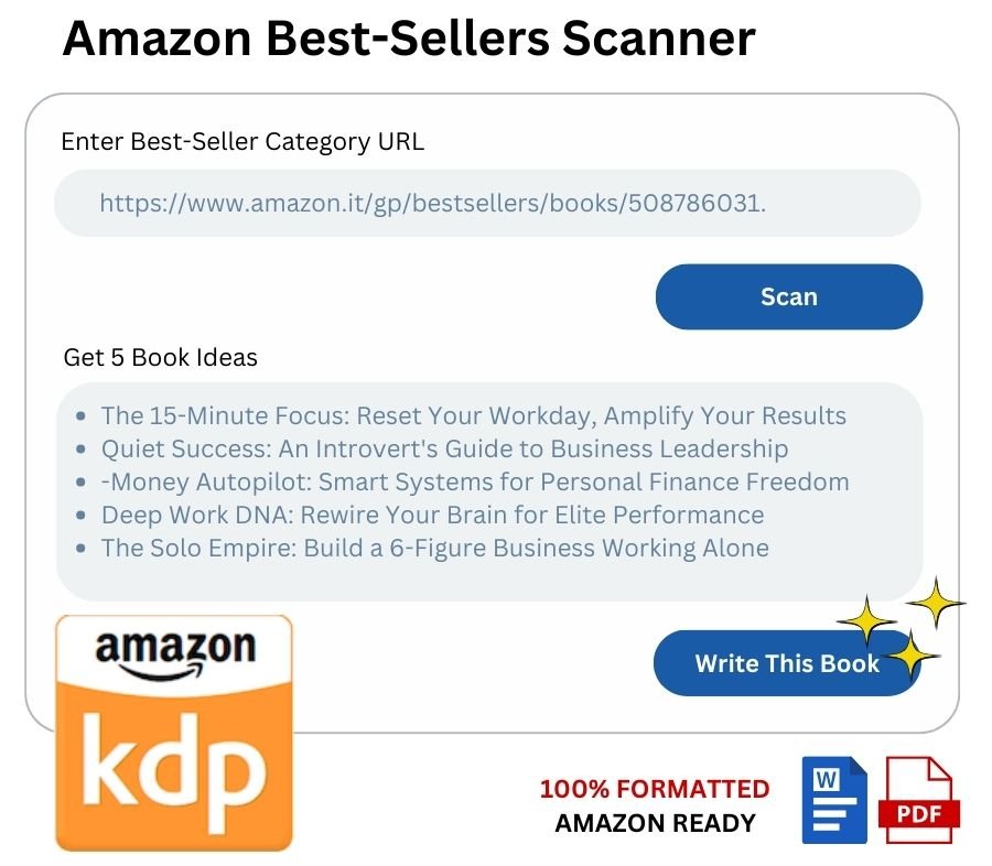 Create books engineered for Amazon success through deep market analysis. Our AI studies your chosen Best-Seller category, analyzes target audience psychology, and generates optimized book concepts with high market potential. Get 5 data-driven book ideas and let our AI identify the most promising one. Perfect for authors targeting specific Amazon categories and entrepreneurs looking to position their books strategically in the marketplace.